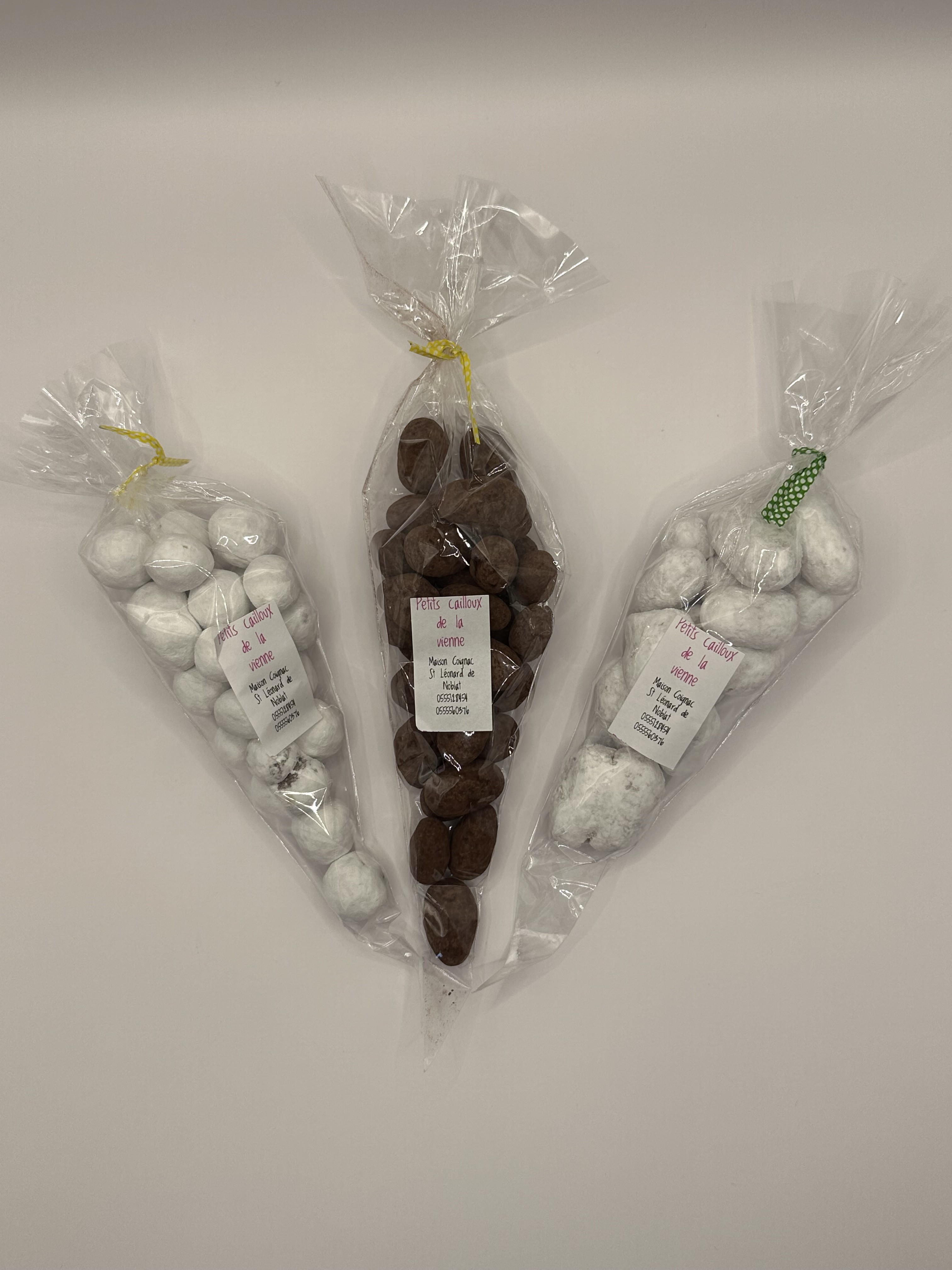 Les petits cailloux de la Vienne sont des gourmandises a croquer , amandes enrobées de chocolat noir, noisettes enrobées de chocolat au lait ou noix enrobées de chocolat blanc